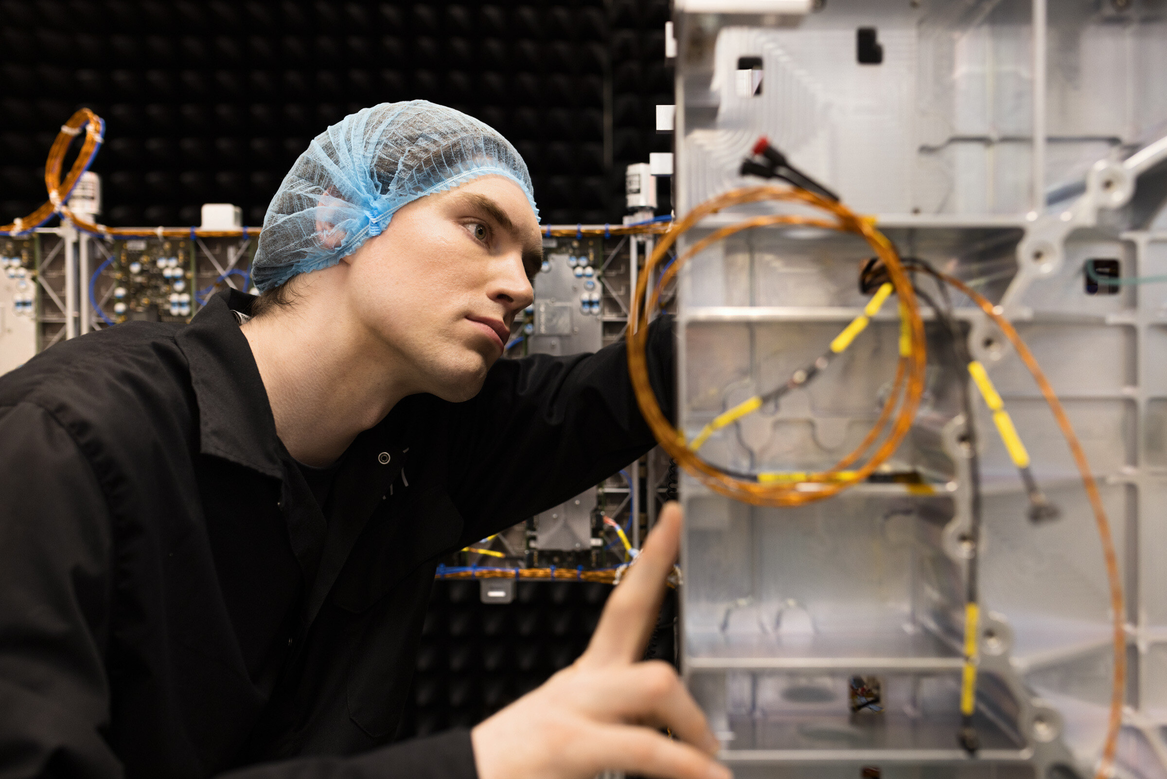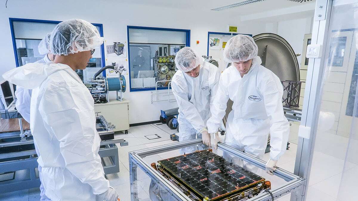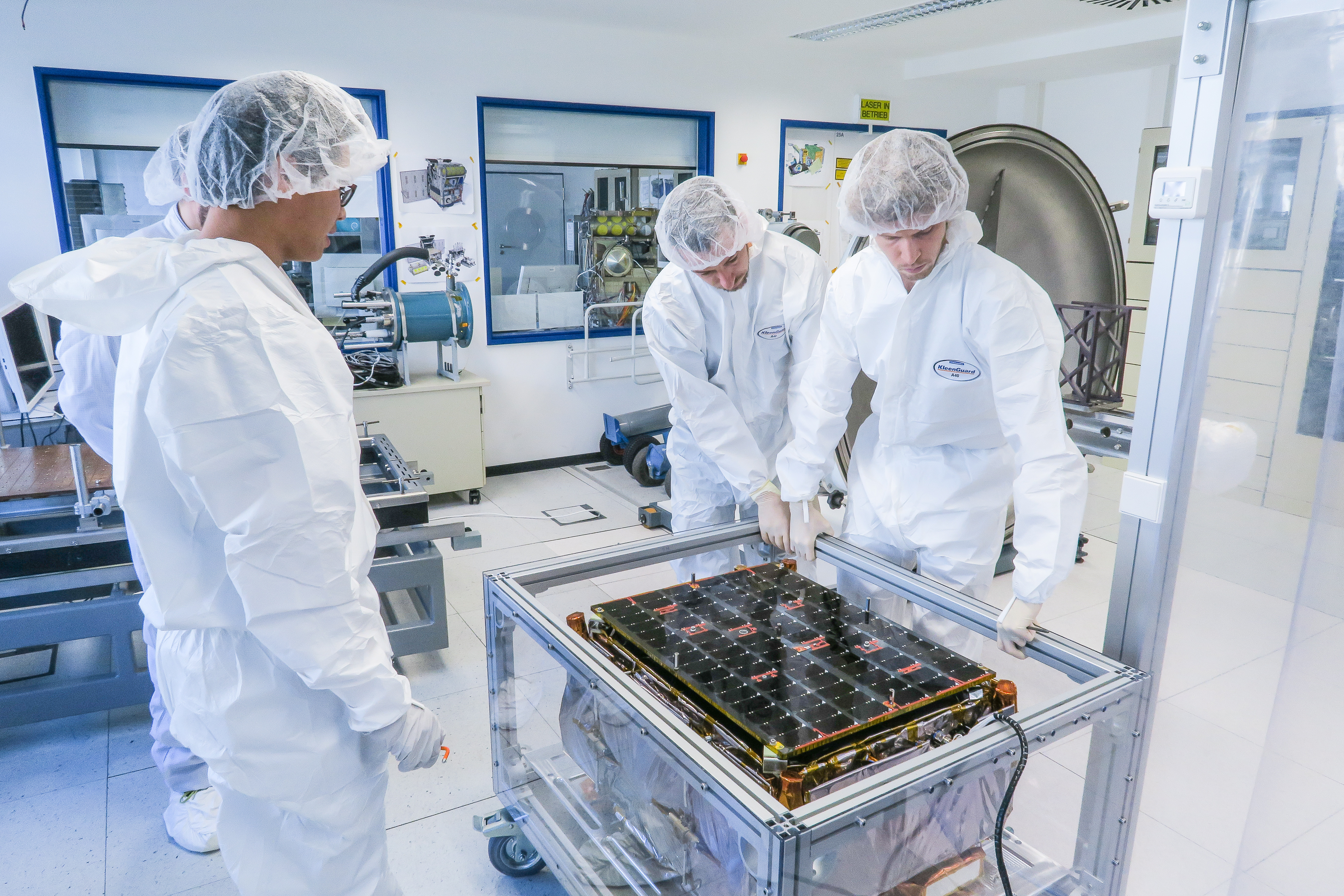 ICEYE specialists inspecting an ICEYE SAR satellite in a clean room.