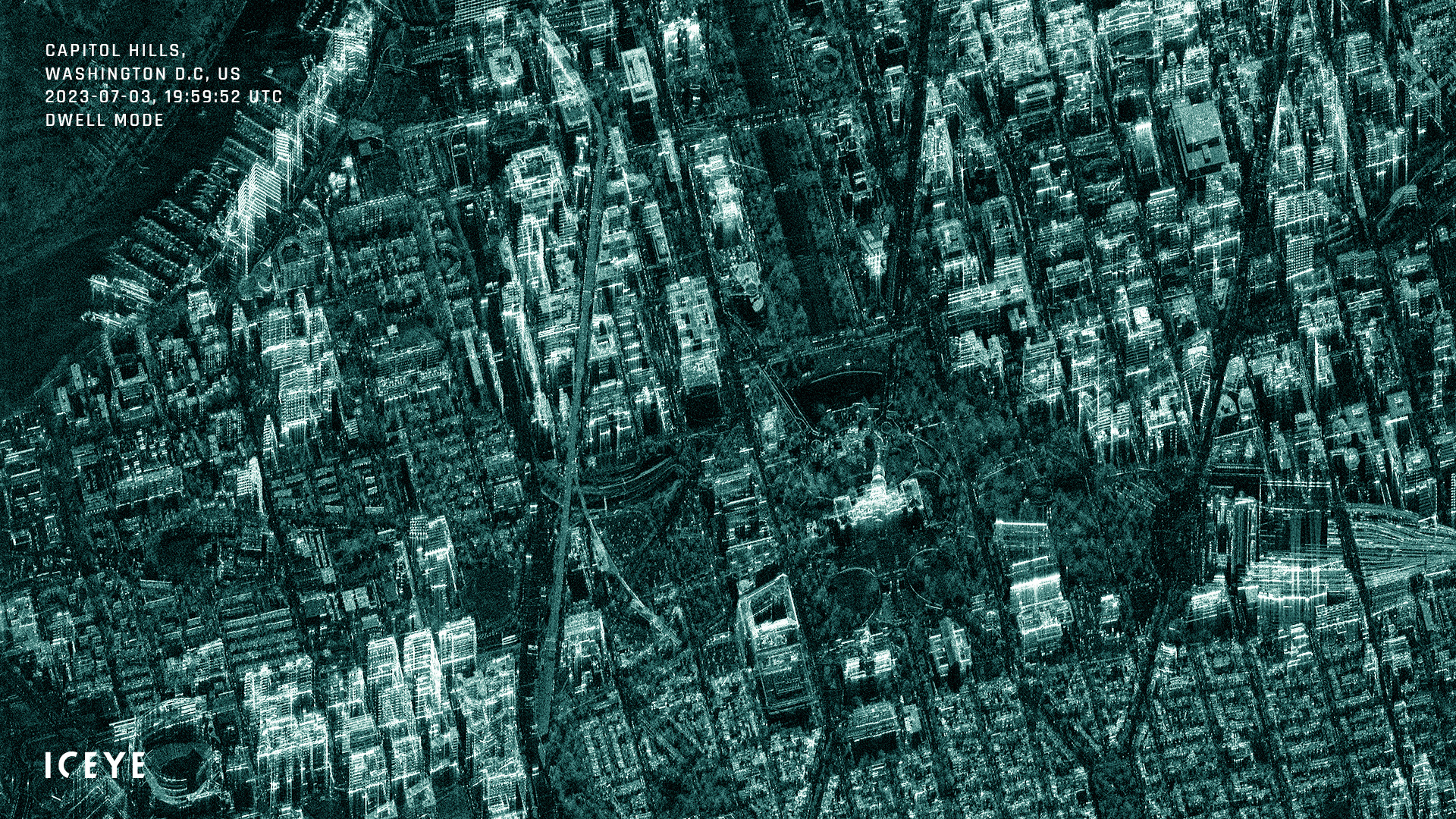 ICEYE Dwell mode image of Washington D.C showcasing Capitol Hill and NASA Mary W. Jackson Headquarters Building. The Dwell product is created from a 25-second collection providing high-fidelity SAR image with superior interpretability.