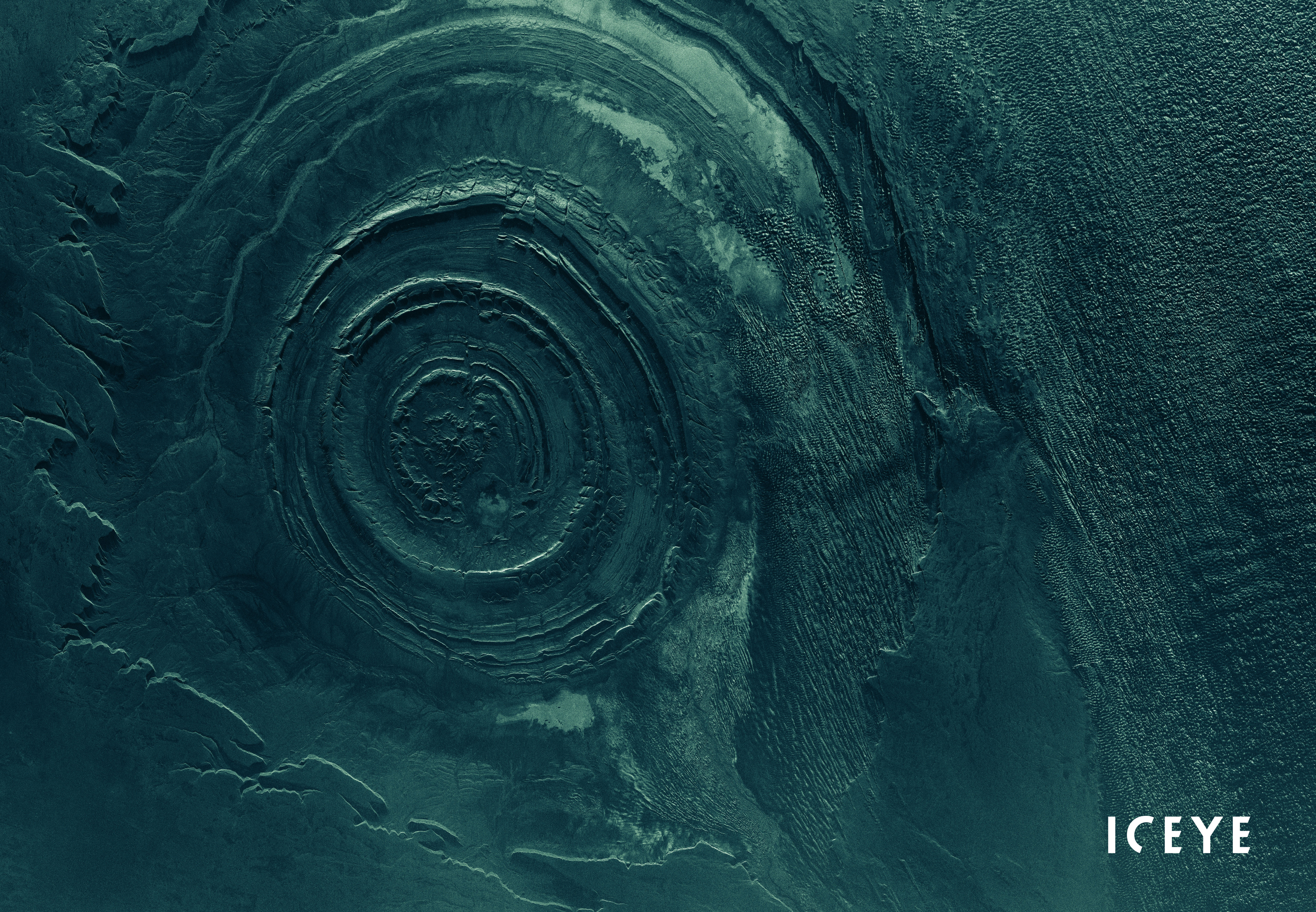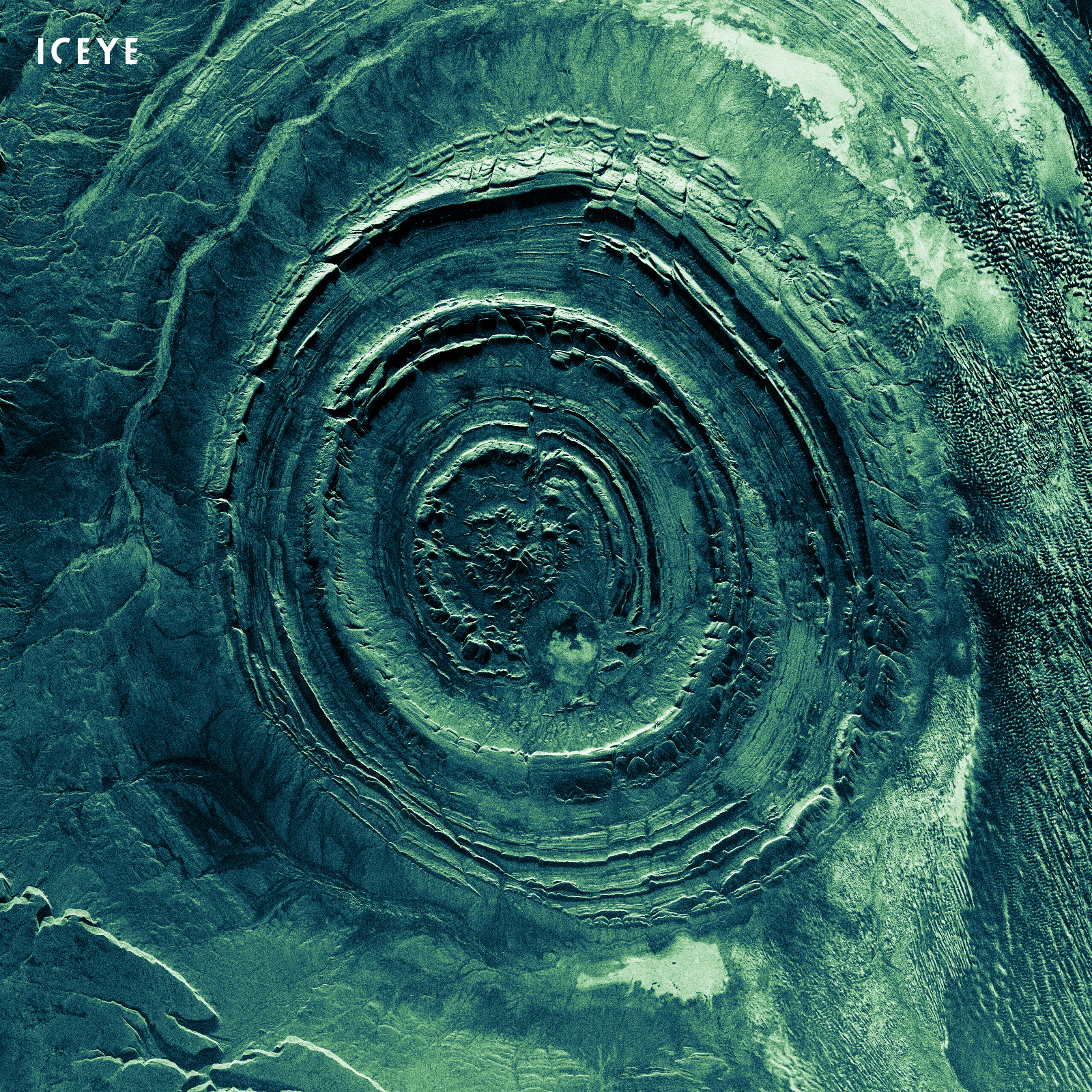 ICEYE radar satellite image of Ouadane, Mauritania, taken on 29 March 2019. The image shows the Richat structure, or the “Eye of Africa”, which is a giant, geological wonder in the Sahara Desert of Mauritania.