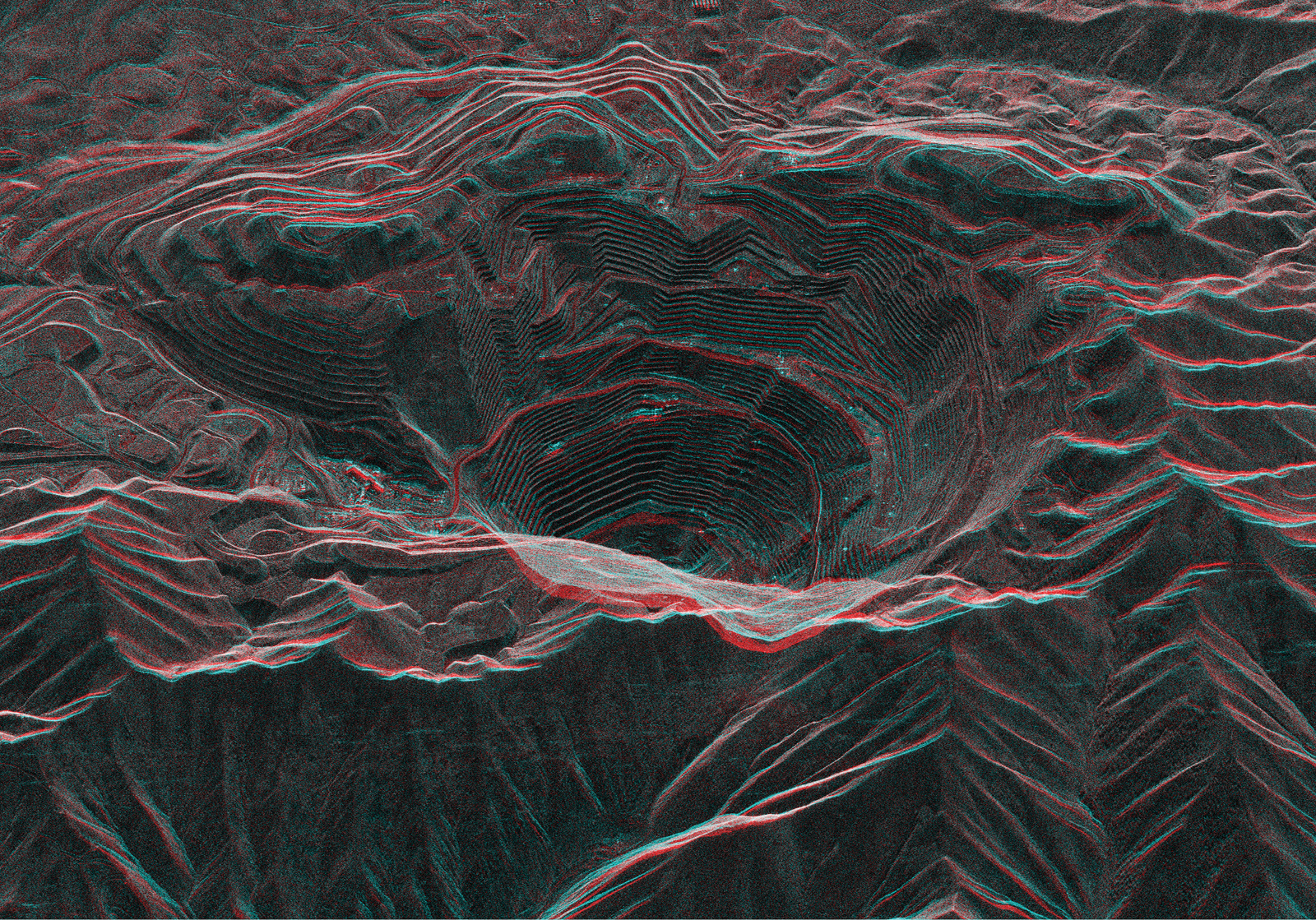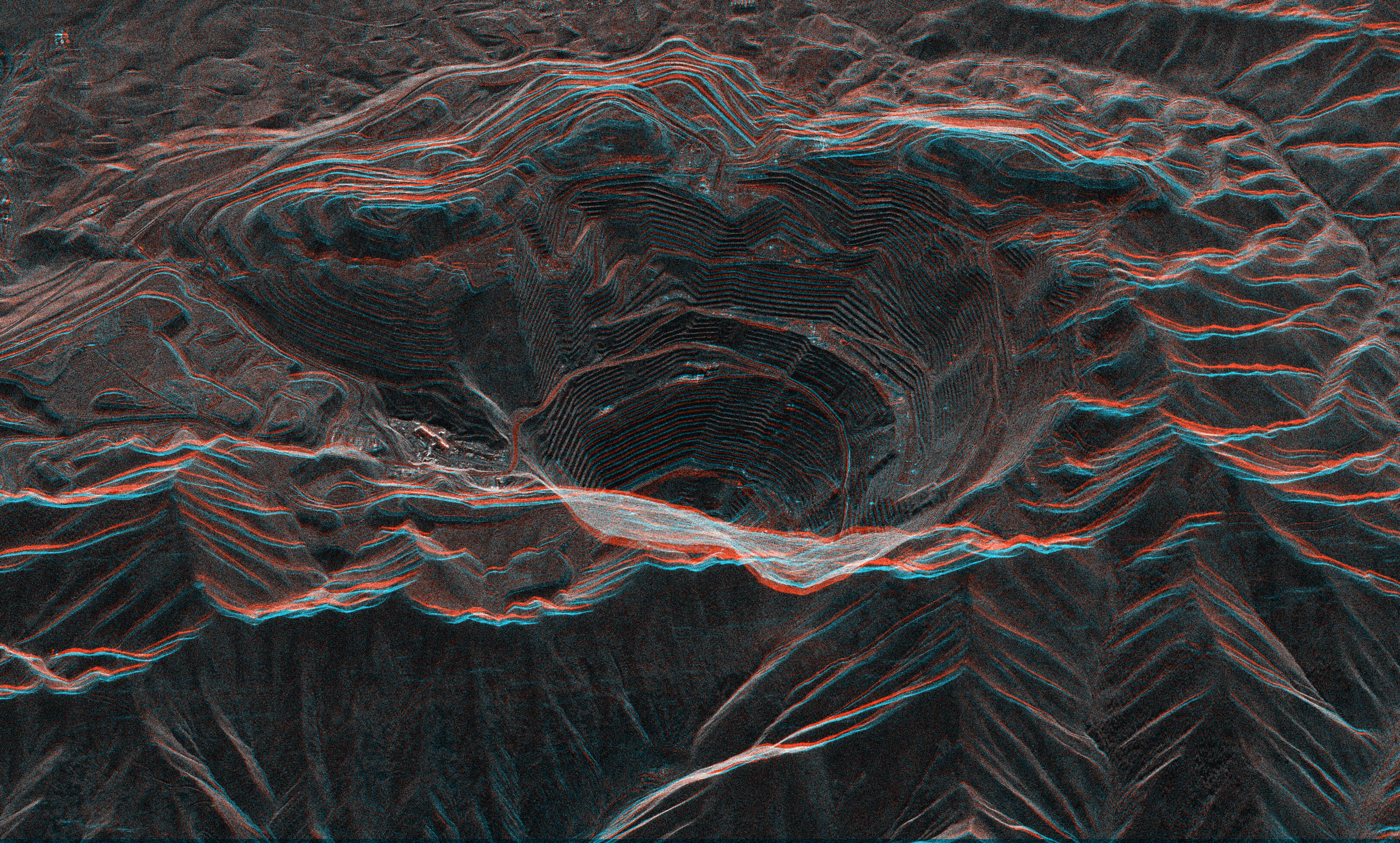 A stereo view of the Bingham Canyon Open Pit Copper Mine in Utah, combined from two ICEYE SAR satellite images.