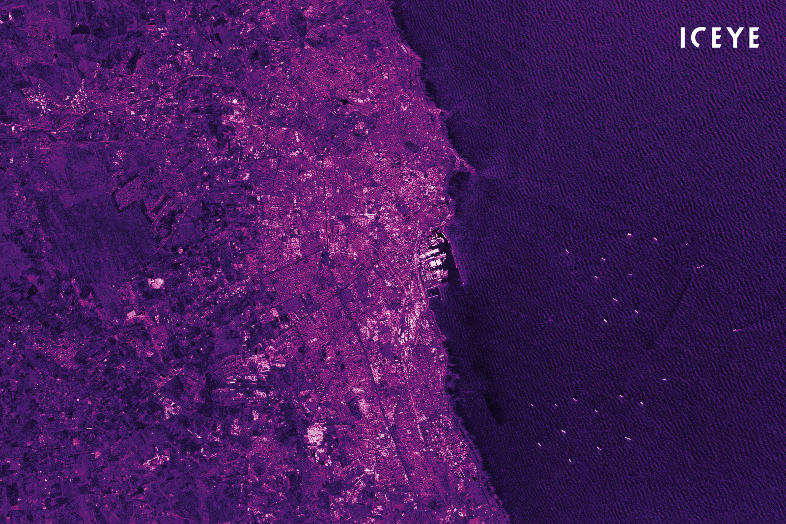 Radar image of the Port of Alexandria, the main port in Egypt, acquired with an ICEYE SAR satellite during the night.