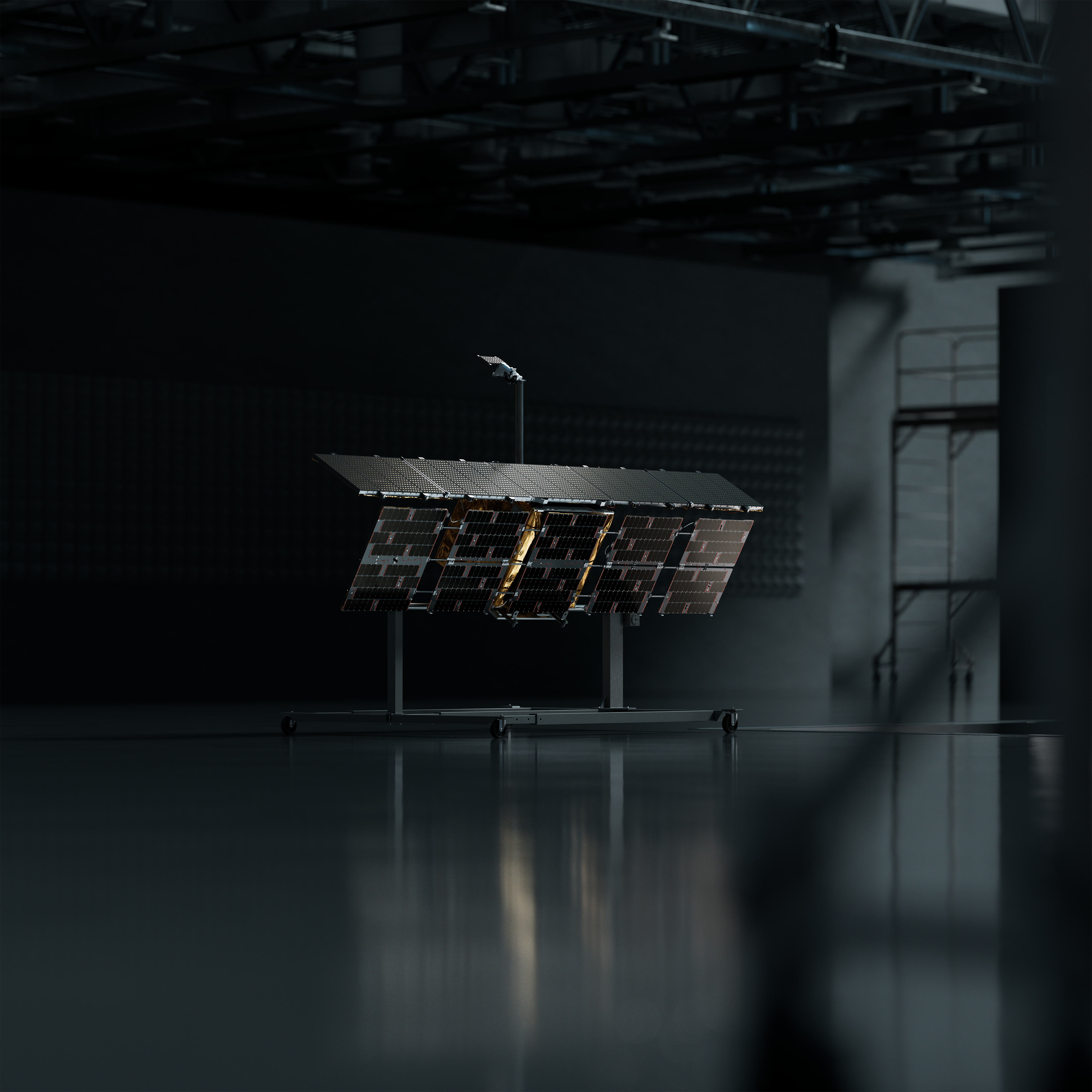 Close-up 3D render of an ICEYE SAR satellite in a showroom.